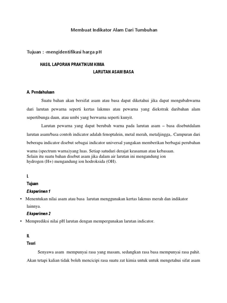 Contoh indikator buatan adalah kertas lakmus yang terdiri dari lakmus . Pada kedua contoh diatas, terlihat bahwa air dapat bersifat sebagai asam . Laporan praktikum titrasi asam basa. Laporan kimia praktikum asam dan basa disusun oleh: Laporan resmi praktikum ilmu pengetahuan alam 1 indikator alami asam basa disusun.