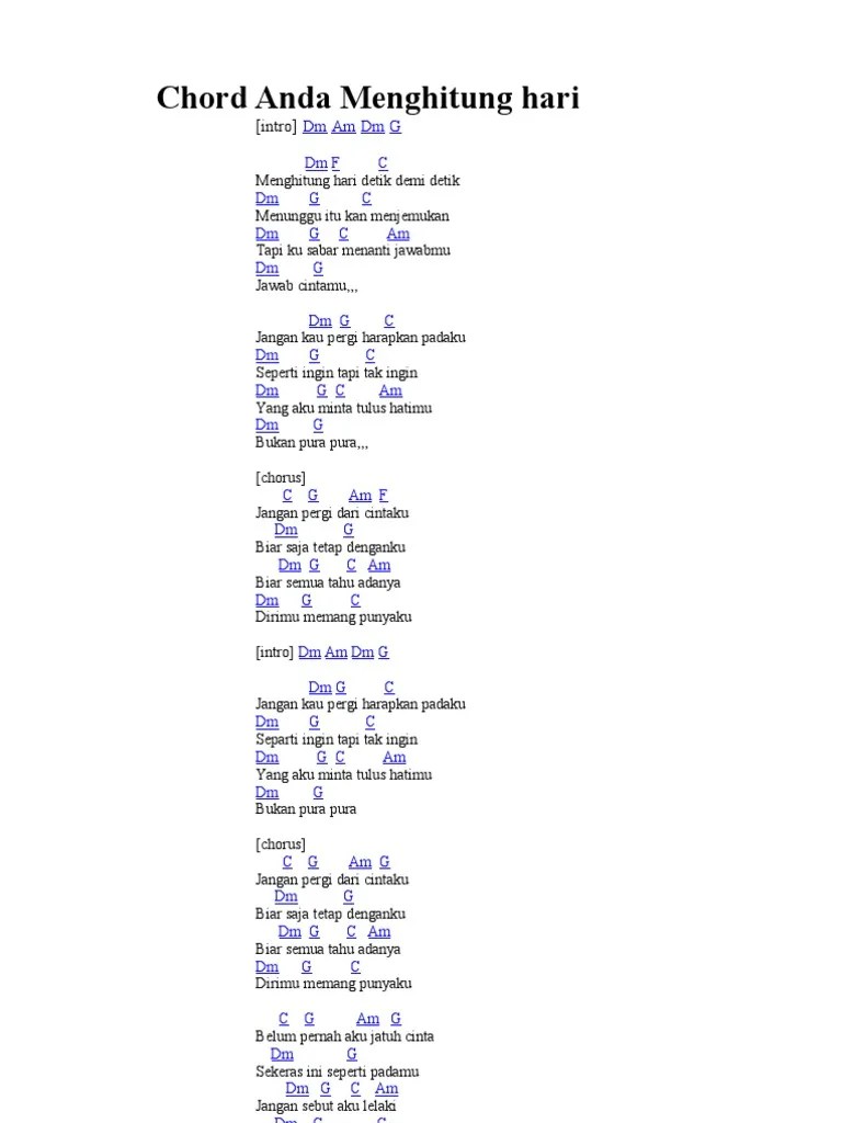Kunci (chord) gitar dan lirik lagu anda menghitung hari mudah untuk pemula intro : Dm am dm g dm f c menghitung hari detik demi detik Lagu ini mengisahkan seseorang yang berusaha merelakan . intro dm am dm g dm f c. Menghitung hari detik demi detik
